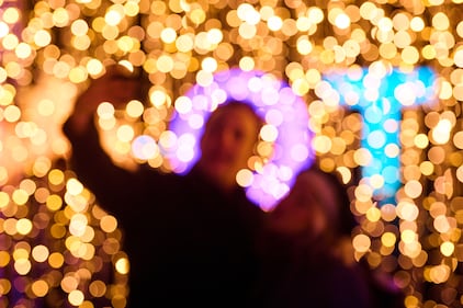 A couple take pictures alongside the light exhibits on the opening night of the annual Cavalcade of Lights at Nathan Phillips Square, in Toronto, on Saturday, Nov. 29, 2025. THE CANADIAN PRESS/Sammy Kogan