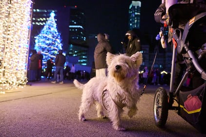 A dog passes through the light installations on the opening night of the annual Cavalcade of Lights at Nathan Phillips Square, in Toronto, on Saturday, Nov. 29, 2025. THE CANADIAN PRESS/Sammy Kogan