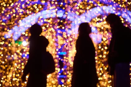 A couple pauses alongside the light exhibits on the opening night of the annual Cavalcade of Lights at Nathan Phillips Square, in Toronto, on Saturday, Nov. 29, 2025. THE CANADIAN PRESS/Sammy Kogan