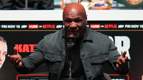 Mike Tyson speaks during a news conference ahead of his fight against Jake Paul, Wednesday, Nov. 13, 2024, in Irving, Texas. (AP Photo/Julio Cortez)