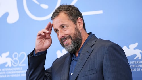 Adam Sandler poses for photographers at the photo call for the film 'Jay Kelly' during the 82nd edition of the Venice Film Festival in Venice on Thursday, Aug. 28, 2025. (Scott A Garfitt/Invision/AP)