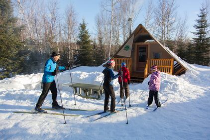 A family skis toward an oTENTik accommodation in this undated image from Parks Canada.