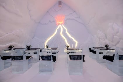 The Hôtel de Glace restaurant is shown in an image from Valcartier.