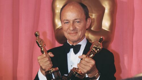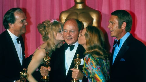 Frank McCarthy holds two Oscars during the Academy Awards Ceremonies. (Getty Images)