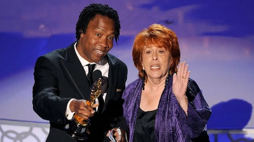 As Roger Ross Williams accepts an Oscar for Prudence, the film’s producer, Elinor Burkett, rushes the stage and takes the mic. (Getty Images)