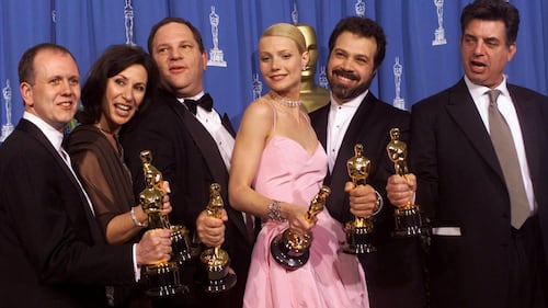 From left to right, David Parfitt, Donna Gigliotti, Harvey Weinstein, Gwyneth Paltrow, Edward Zwick and Marc Norman all celebrate after receiving the Oscar for best picture for "Shakespeare In Love" during the 71st Annual Academy Awards Sunday, March 21, 1999, at the Dorothy Chandler Pavilion of the Los Angeles Music Center. (AP Photo/Dave Caulkin)