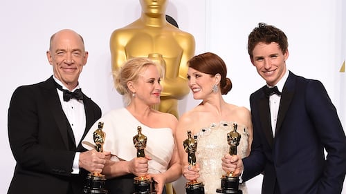 Actors J.K. Simmons, Patricia Arquette, Julianne Moore and Eddie Redmayne pose in the press room during the 87th Annual Academy Awards on Feb. 22, 2015. (Steve Granitz/WireImage)