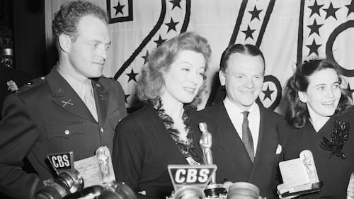 Van Heflin, Greer Garson, James Cagney, and Teresa Wright hold their Oscars on March 8, 1943. (Getty)