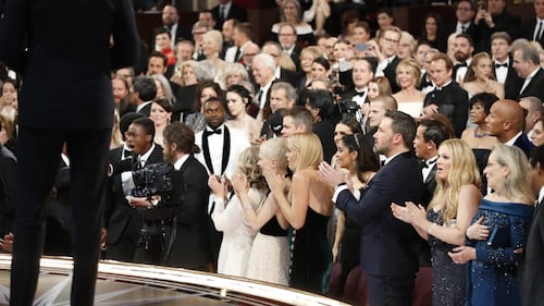 The star-studded crowd at the Oscars reacts in shock when "Moonlight" is revealed as the best picture winner. (Al Seib / Los Angeles Times via Getty Images)