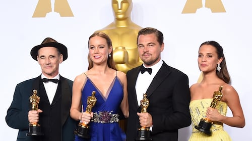 Actor Mark Rylance, winner of Best Supporting Actor for 'Bridge of Spies,' actress Brie Larson, winner of Best Actress for 'Room,' actor Leonardo DiCaprio, winner of Best Actor for 'The Revenant,' and actress Alicia Vikander, winner of Best Supporting Actress for 'The Danish Girl,' pose in the press room during the 88th Annual Academy Awards on Feb. 28, 2016. (Jason Merritt/Getty Images)