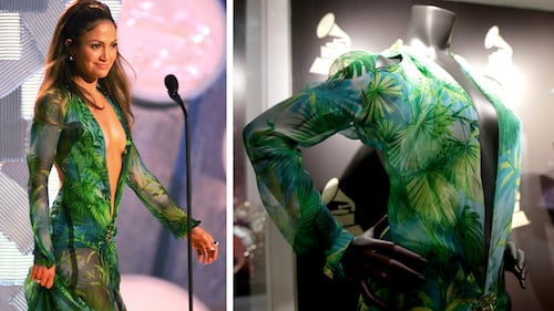 Jennifer Lopez in a Versace jungle dress of green silk chiffon at the 42nd Grammy Awards in Los Angeles, Feb. 23, 2000. (AP Photo/Kevork Djansezian)