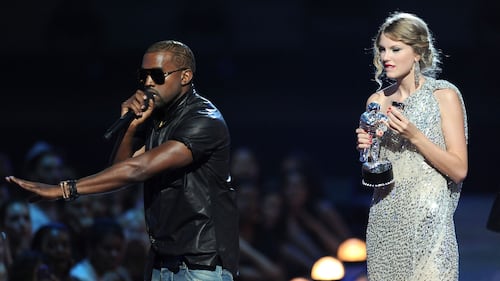 Kanye West takes the microphone from Taylor Swift and speaks onstage during the 2009 MTV Video Music Awards at Radio City Music Hall on Sept. 13, 2009 in New York City. (Kevin Mazur/WireImage)