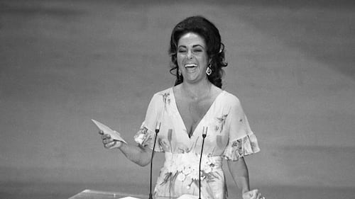 Presenter Elizabeth Taylor on stage at the 1974 Oscars after the streaking incident. (Getty)