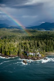 The lodge is located on the Pacific coast of Vancouver Island and is only reachable by boat or sea plane.