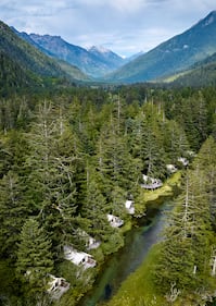 The lodge features 25 spacious canvas tents on wood platforms connected by cedar plank walkways.