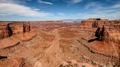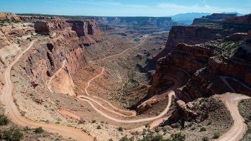 The view from the Shafer Canyon Overlook towards La Sal mountains in Canyonlands National Park in Utah. (Andrew Lloyd/Loop Images/Universal Images Group via Getty Images)