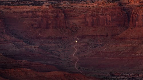 The Shafer Canyon dirt road is viewed at sunrise on October 7, 2023 near Moab, Utah. (George Rose/Getty Images)