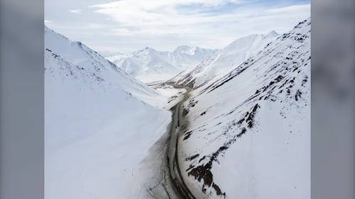 An aerial view of the Dalton Highway on May 10, 2025 at Atigun Pass in the Brooks Range area of North Slope Borough, Alaska. (Lance King/Getty Images)