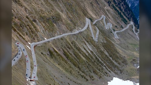 A photo shows the winding roads of Stelvio Pass, on the mountainside of the Autonomous Region of Trentino-Alto Adige, Italy on May 28, 2022. (Andrea Carrubba/Anadolu Agency via Getty Images)