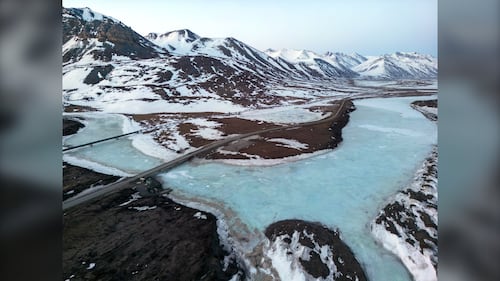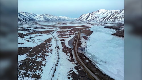 An aerial view of the Dalton Highway and a portion of the Trans Alaska Pipeline System (TAPS) crossing over the frozen Atigun River during the early morning hours of May 9, 2025 about 22 miles north of Atigun Pass in North Slope Borough, Alaska. (Lance King/Getty Images)