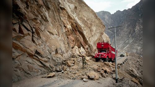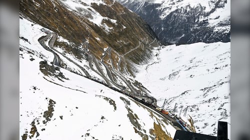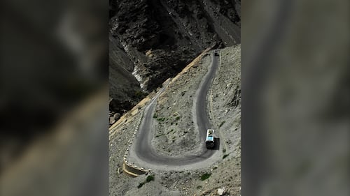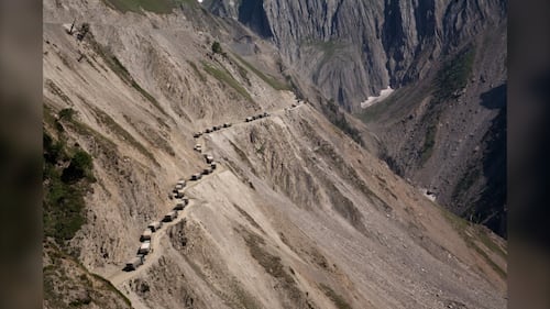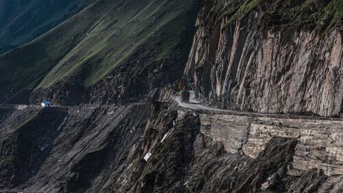 Known for having one of the most treacherous drives in the world, Zoji La, also known as the Zojila Pass, is a high mountain pass in the Himalayas. Vehicles move near the Zojila mountain pass in Ganderbal, Jammu and Kashmir, India, on July 24, 202. (Nasir Kachroo/NurPhoto via Getty Images)