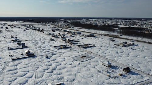This aerial view shows the bumpy landscape of mounds and hollows formed by thawing permafrost, known as "bylars" in the Yakut language, in the settlement of Churapcha, around 135 kilometres from the eastern Siberian city of Yakutsk, on March 29, 2025. (EKATERINA ANISIMOVA/AFP via Getty Images)