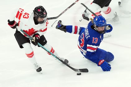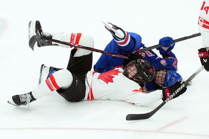 Canada's Claire Thompson (42) and United States' Abbey Murphy (37) get tangled up during the first period of the women's gold medal hockey game at the 2026 Winter Olympics, in Milan, Thursday, Feb. 19, 2026. THE CANADIAN PRESS/Nathan Denette