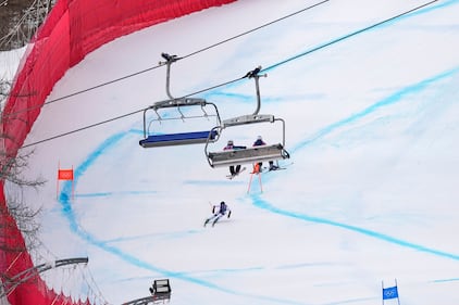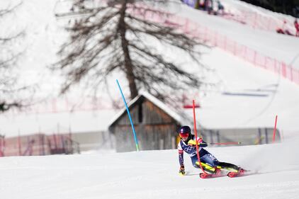 United States' Mikaela Shiffrin competes in at the finish area of an alpine ski, women's slalom race, at the 2026 Winter Olympics, in Cortina d'Ampezzo, Italy, Wednesday, Feb. 18, 2026. (AP Photo/Andy Wong)