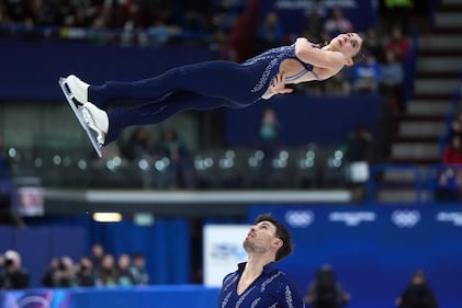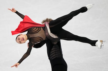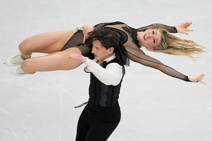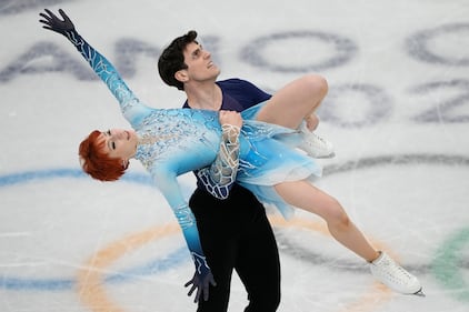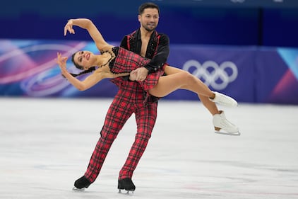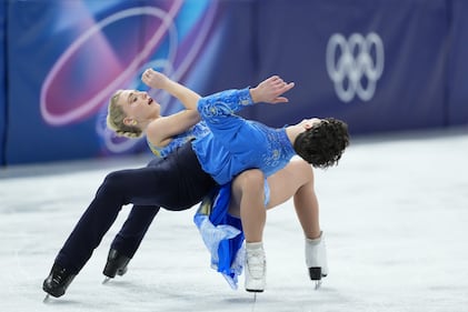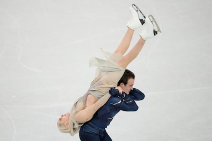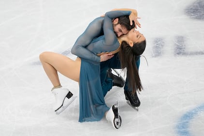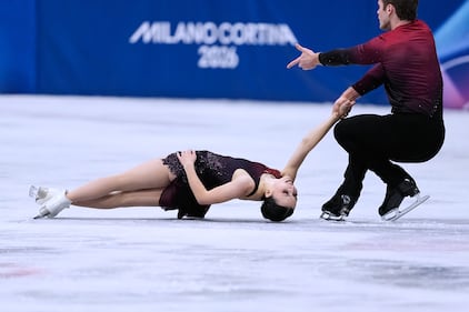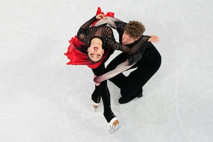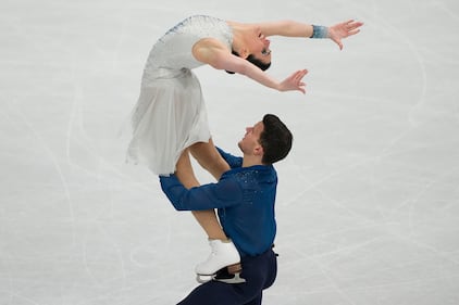 Madison Chock and Evan Bates of the United States compete during the ice dancing free skate in figure skating at the 2026 Winter Olympics, in Milan, Italy, Wednesday, Feb. 11, 2026. (AP Photo/Bernat Armangue)