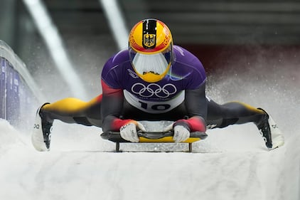 Germany's Axel Jungk arrives at the finish during a men's skeleton run at the 2026 Winter Olympics, in Cortina d'Ampezzo, Italy, Thursday, Feb. 12, 2026. (AP Photo/Alessandra Tarantino)