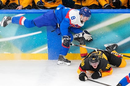 Germany's Tim Stutzle (18) is challenged by Slovakia's Oliver Okuliar (8) during a men's ice hockey quarterfinal game between Slovakia and Germany at the 2026 Winter Olympics, in Milan, Italy, Wednesday, Feb. 18, 2026. (AP Photo/Petr David Josek)