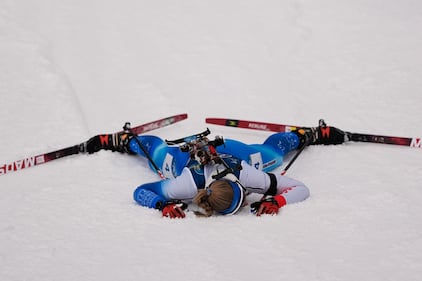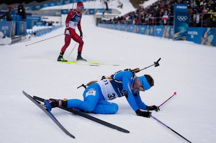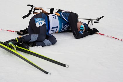Tuuli Tomingas, of Estonia, collapses after crossing the finish line of the women's 15-kilometer individual biathlon race at the 2026 Winter Olympics in Anterselva, Italy, Wednesday, Feb. 11, 2026. (AP Photo/Mosa'ab Elshamy)
