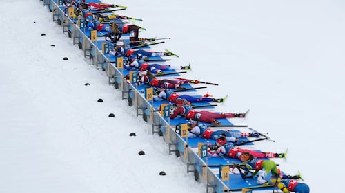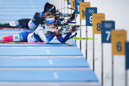 A view of the shooting range in the women's 4x6-kilometer relay biathlon race at the 2026 Winter Olympics in Anterselva, Italy, Wednesday, Feb. 18, 2026. (AP Photo/Mosa'ab Elshamy)