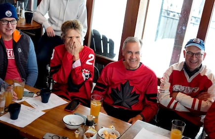 Prime Minister Mark Carney and his wife Diana Fox Carney join family and friends to watch the gold medal men's ice hockey game between Canada and the United States at the 2026 Milan Cortina Winter Olympics, at a pub in Chelsea, Que., on Sunday, Feb. 22, 2026. THE CANADIAN PRESS/Justin Tang
