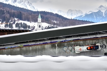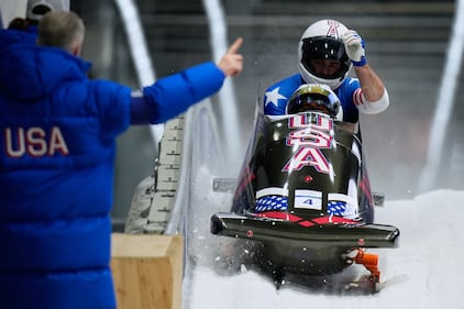 United States' Frankie del Duca, front, and Joshua Williamson arrive at the finish during a two man bobsled run at the 2026 Winter Olympics, in Cortina d'Ampezzo, Italy, Monday, Feb. 16, 2026. (AP Photo/Aijaz Rahi)