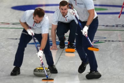 United States' Ben Richardson in action during the men's curling round robin session against Canada, at the 2026 Winter Olympics, in Cortina d'Ampezzo, Italy, Friday, Feb. 13, 2026. (AP Photo/Fatima Shbair)