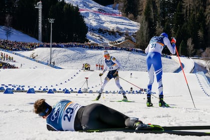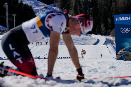 Fredrik Fodstad, of Colombia, center approaches the finish line while Niks Saulitis, of Latvia, foreground catches his breath in the foreground during the cross country skiing men's 10km interval start free at the 2026 Winter Olympics, in Tesero, Italy, Friday, Feb. 13, 2026. (AP Photo/Evgeniy Maloletka)