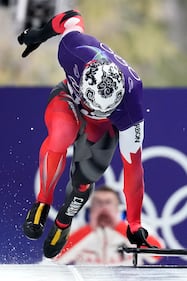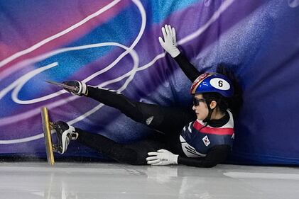 Kim Gilli of South Korea crashes during the women's 1000 meter short track speed skating at the 2026 Winter Olympics, in Milan, Italy, Monday, Feb. 16, 2026. (AP Photo/Natacha Pisarenko)