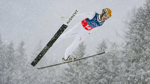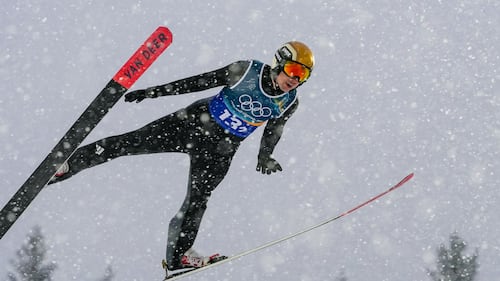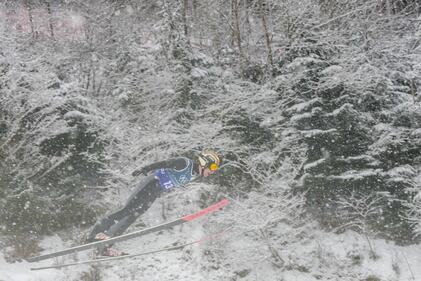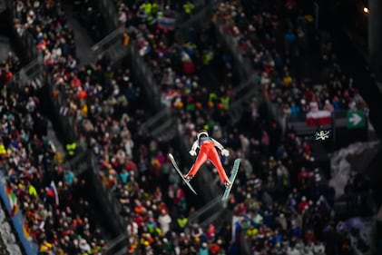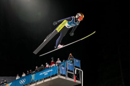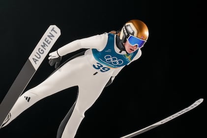 Vinzenz Geiger, of Germany, soars through the air during the nordic combined team sprint at the 2026 Winter Olympics, in Predazzo, Italy, Thursday, Feb. 19, 2026. (AP Photo/Evgeniy Maloletka)
