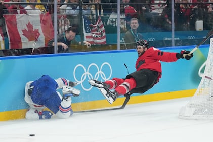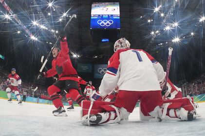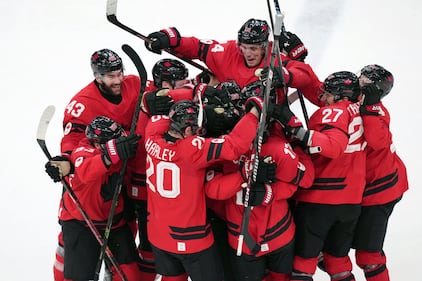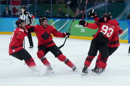 Team Canada players celebrate Canada's Mitch Marner's game-winning goal during overtime of a quarterfinal men's hockey game against Czechia at the 2026 Winter Olympics, in Milan, on Wednesday, Feb. 18, 2026. THE CANADIAN PRESS/Darryl Dyck