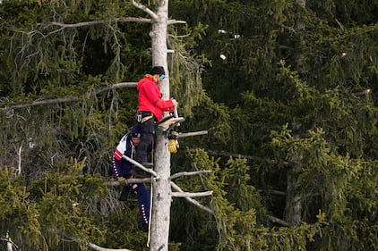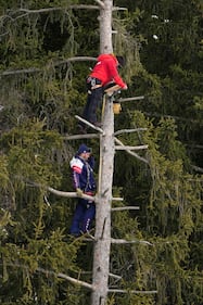 Coaches up on a tree during a men's super-G race, at the 2026 Winter Olympics, in Bormio, Italy, Wednesday, Feb.11, 2026. (AP Photo/John Locher)