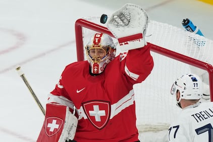 Switzerland's goalkeeper Leonardo Genoni , makes a save during a preliminary round match of men's ice hockey between Switzerland and France at the 2026 Winter Olympics, in Milan, Italy, Thursday, Feb. 12, 2026. (AP Photo/Carolyn Kaster)