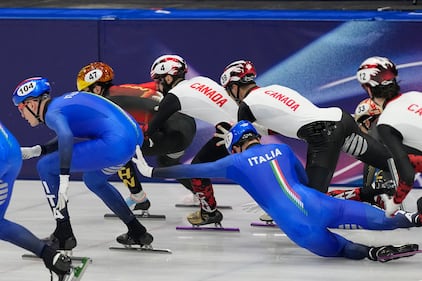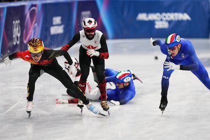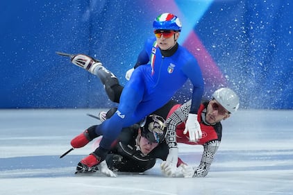 Italy's Pietro Sighel, front, Latvia's Reinis Berzins and Turkey's Furkan Akar crash during a men's 500 metre short track speedskating heat at the 2026 Winter Olympics, in Milan, on Monday, February 16, 2026. THE CANADIAN PRESS/Darryl Dyck