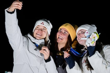From left, silver medalist China's Li Fanghui, gold medalist China's Eileen Gu and bronze medalist Britain's Zoe Atkin take a selfie after the women's freestyle skiing halfpipe final at the 2026 Winter Olympics, in Livigno, Italy, Sunday, Feb. 22, 2026. (AP Photo/Lindsey Wasson)