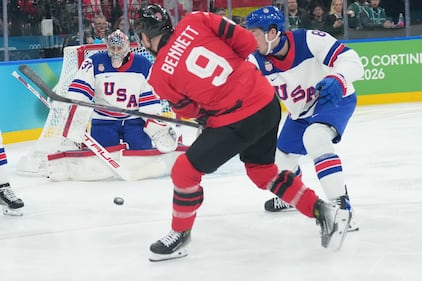 Canada's Sam Bennett (9) shoots on United States goalie Connor Hellebuyck (37) during first period action for the men's gold medal hockey game at the 2026 Winter Olympics in Milan, on Sunday, Feb. 22, 2026. THE CANADIAN PRESS/Nathan Denette