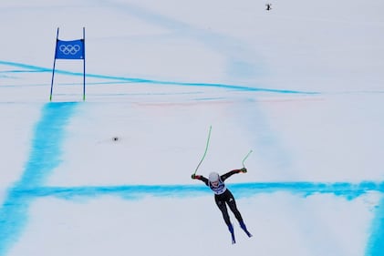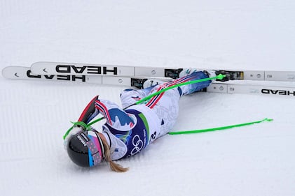 Czechia's Ester Ledecka falls during an alpine ski, women's super-G race, at the 2026 Winter Olympics, in Cortina d'Ampezzo, Italy, Thursday, Feb. 12, 2026. (AP Photo/Andy Wong)