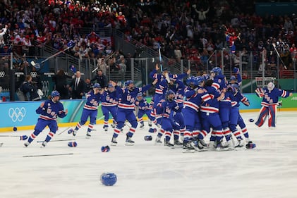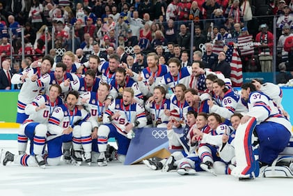 Gold medalists United States celebrate after defeating Canada in a men's ice hockey gold medal game between Canada and the United States at the 2026 Winter Olympics, in Milan, Italy, Sunday, Feb. 22, 2026. (AP Photo/Petr David Josek)