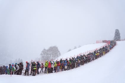 Fans leave after following ski mountaineering women's and men's heats, at the 2026 Winter Olympics, in Bormio, Italy, Thursday, Feb. 19, 2026. (AP Photo/Rebecca Blackwell)