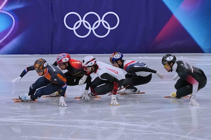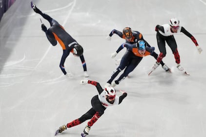 Netherlands' Selma Poutsma (83) crashes between Canada's Courtney Sarault (14) and Canada's Kim Boutin (13) forcing a restart during the women's 500 metre short track speedskating finals at the 2026 Winter Olympics, in Milan, on Thursday, February 12, 2026. THE CANADIAN PRESS/Darryl Dyck