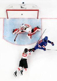 France's Floran Douay (91) scores a goal against Canada's goalkeeper Jordan Binnington (50) in the first period during a preliminary round game of men's ice hockey between Canada and France at the 2026 Winter Olympics, in Milan, Italy, Sunday, Feb. 15, 2026. (Bruce Bennett/Pool Photo via AP)